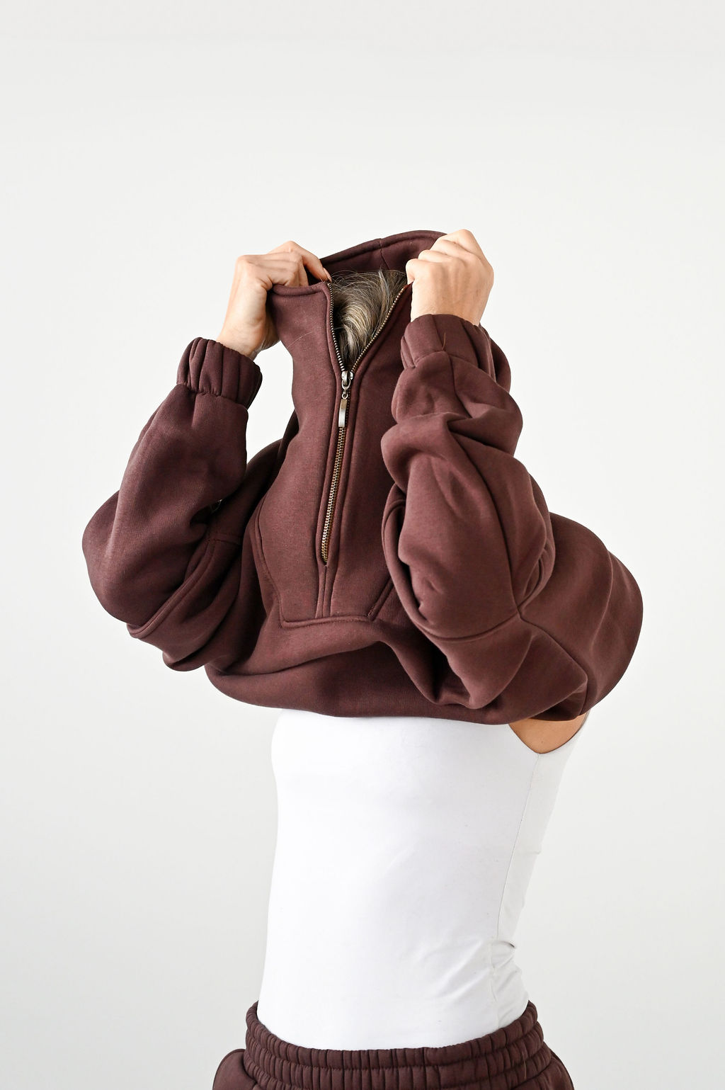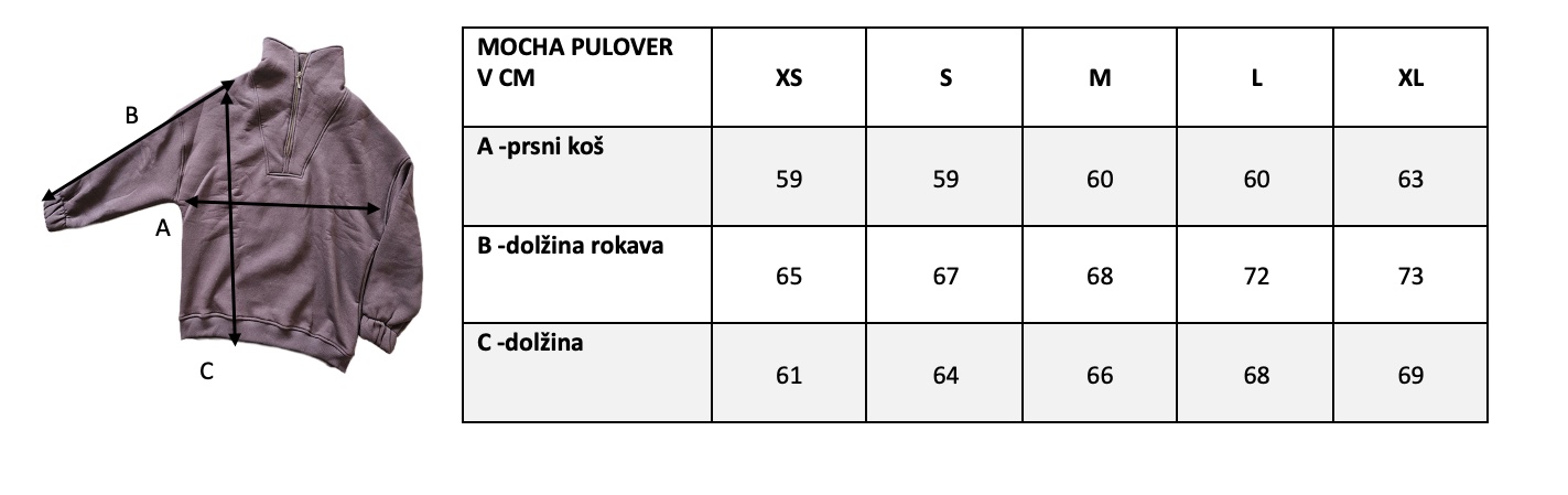 Pulover je oversize z zadrgo (bronaste barve). Pulover ima visok ovratnik.